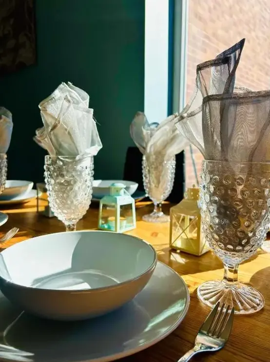 Alle borden, bestek, glazen en ander servies voor het decor.